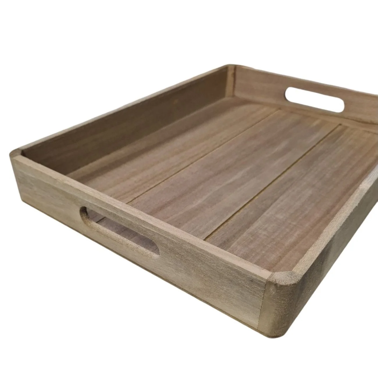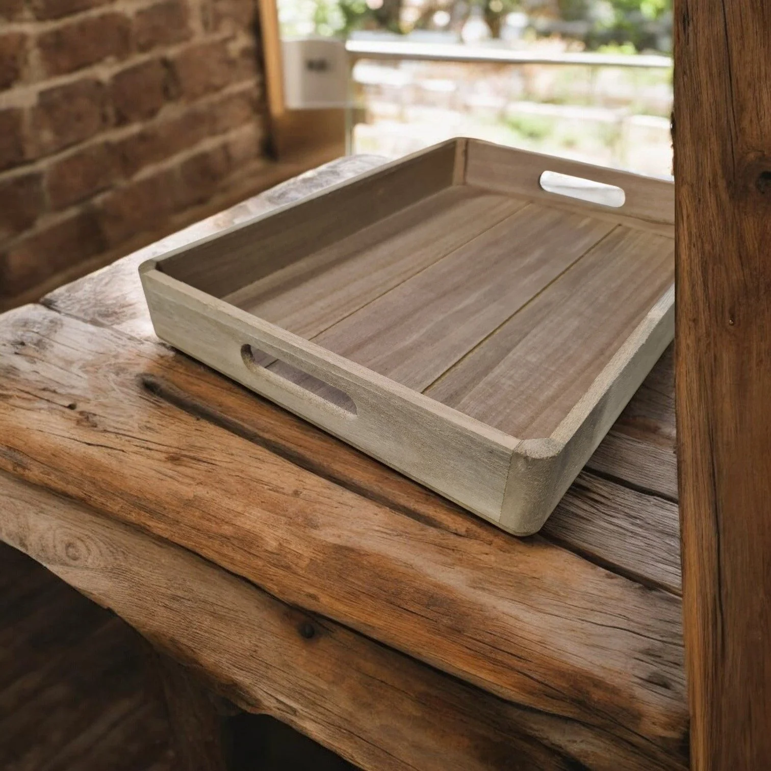 Dekotablett aus Holz – rechteckiges Tablett in Grau mit Griffen