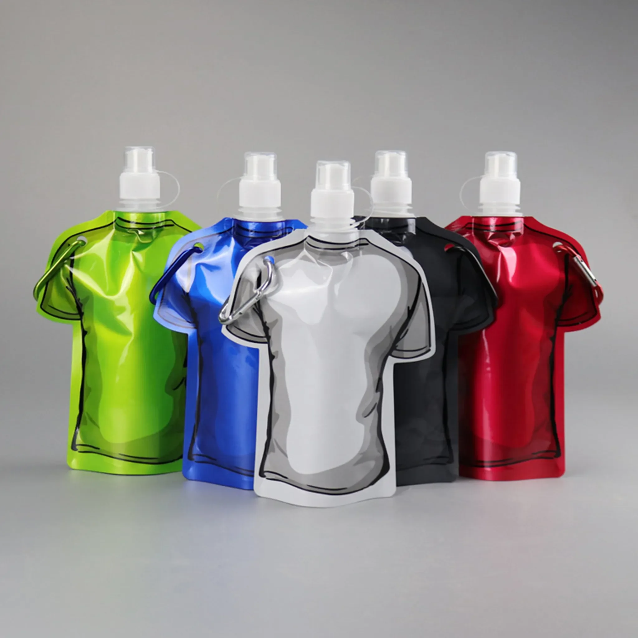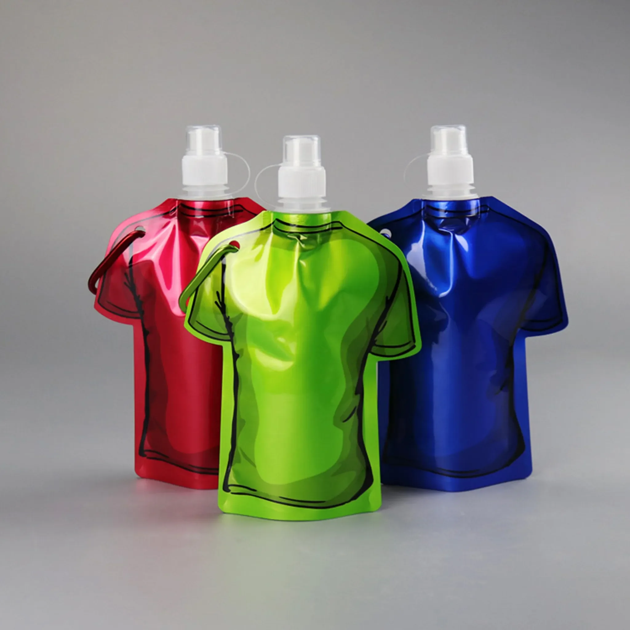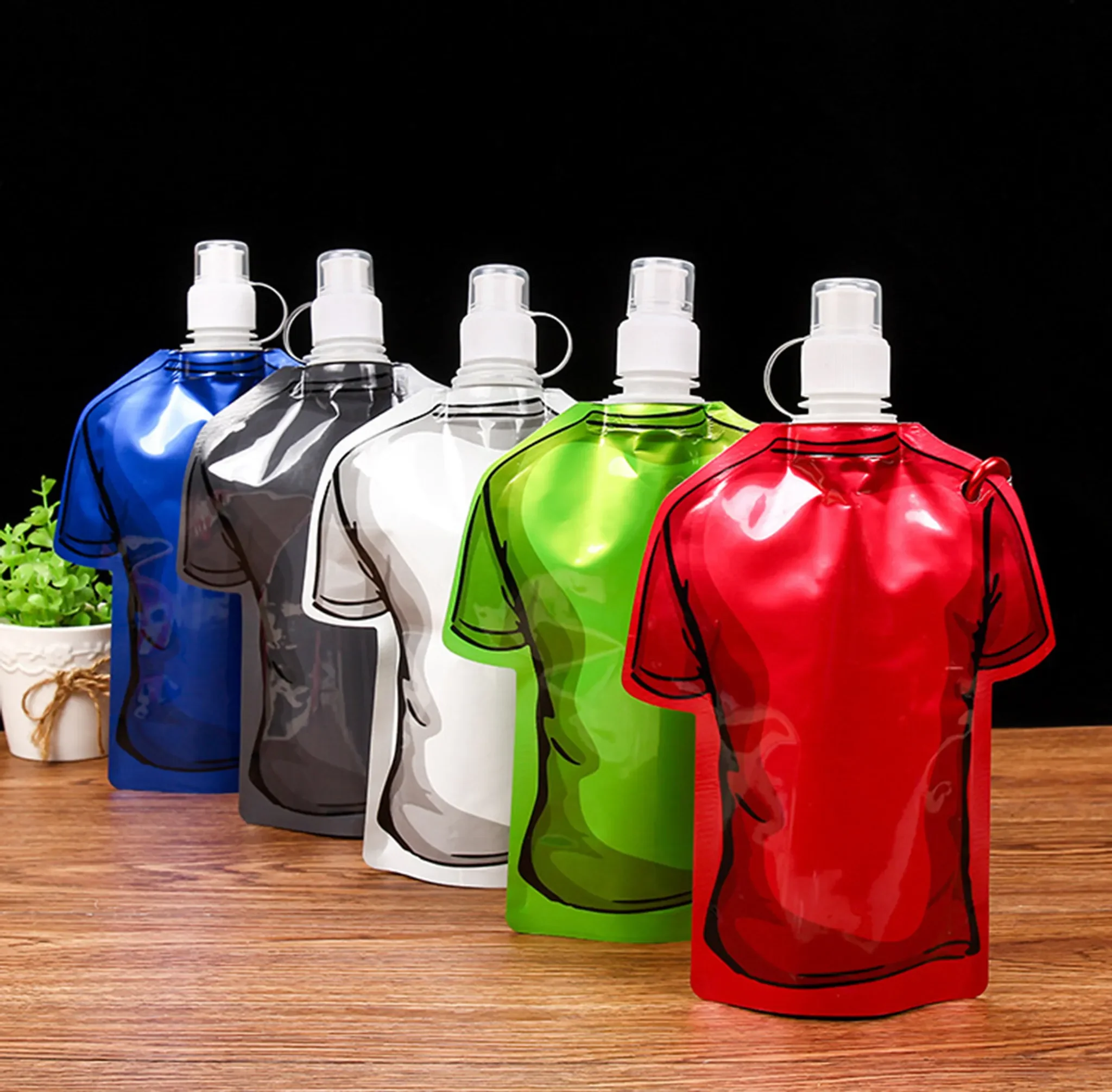 Hergestellt aus hochwertigem, wasserdichtem und umweltfreundlichem PET/PA/PE-Material, bietet der Wasserbeutel Sicherheit und Wiederverwendbarkeit. Der Klappdeckel sorgt für eine auslaufsichere Nutzung, während das T-Shirt-Design für einen originellen und auffälligen Look sorgt.