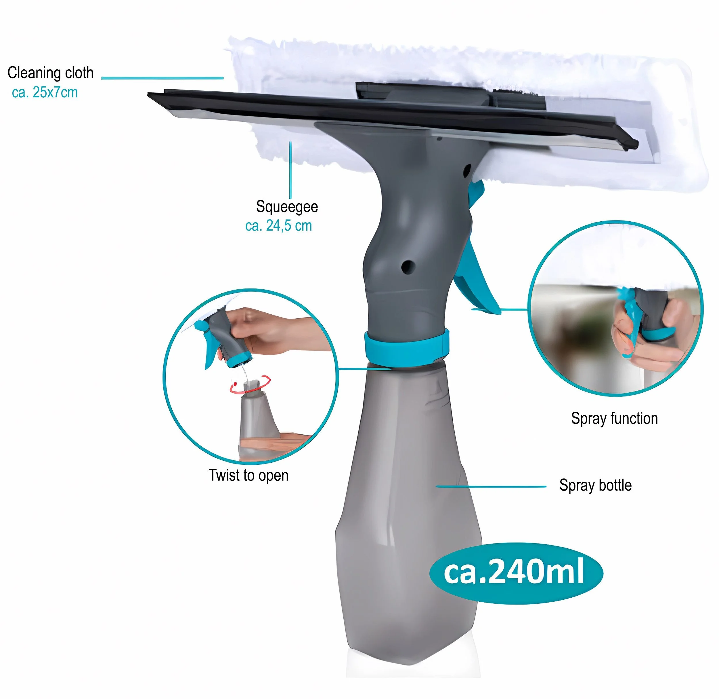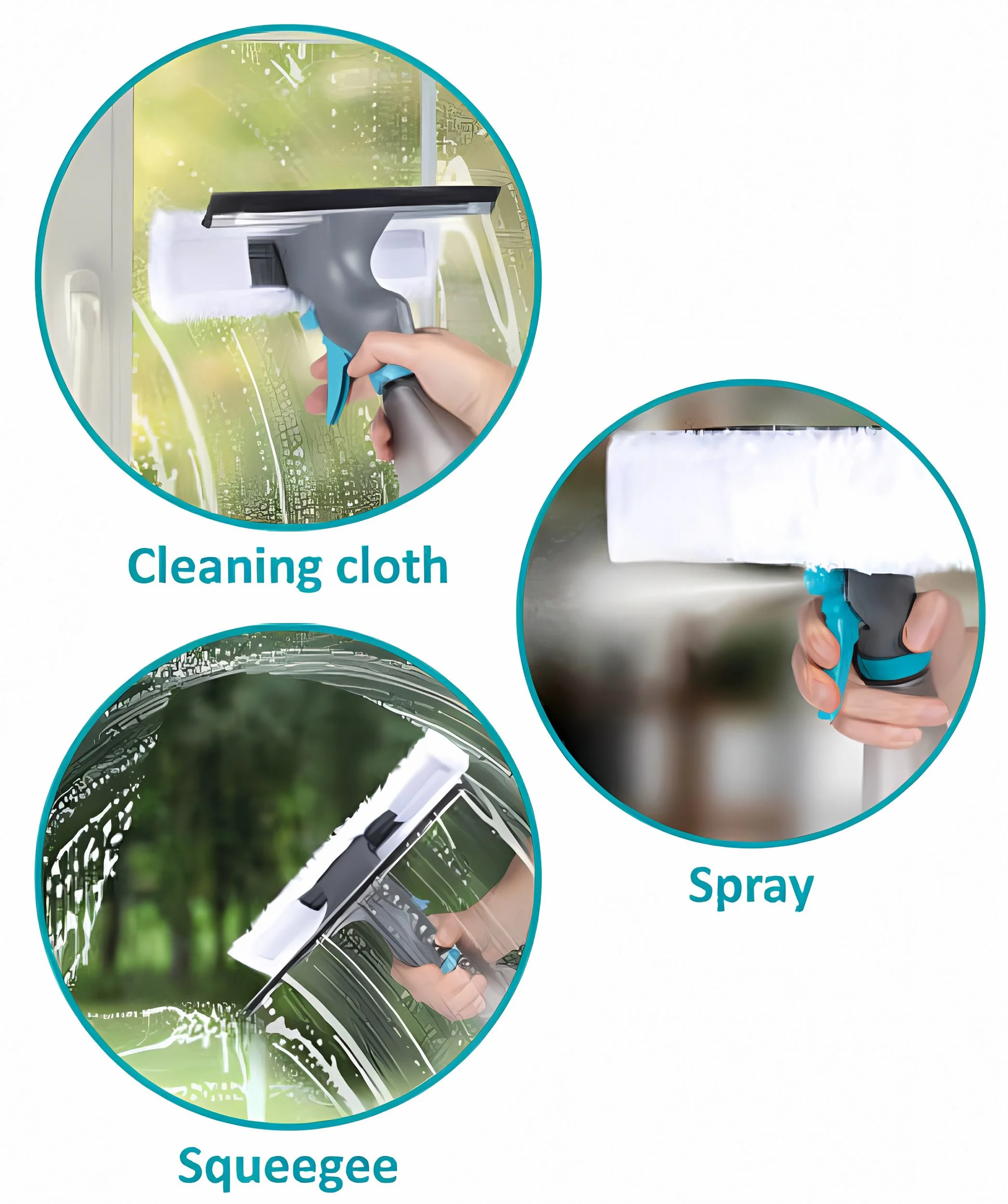 Praktisches 3in1 Fensterreiniger Set für effiziente und streifenfreie Reinigung. Sprühen, reinigen und trocknen in einem Schritt – ideal für Zuhause, Büro oder andere Räume mit Fenstern.