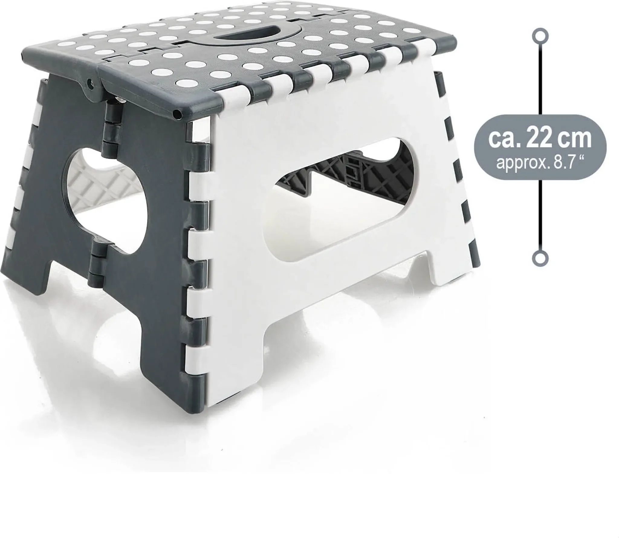 Die strukturierte Oberfläche mit Gumminoppen sorgt für einen rutschfesten Stand. Dank integriertem Tragegriff ist der Klapptritt leicht zu transportieren und kann platzsparend in Nischen oder Schränken verstaut werden.