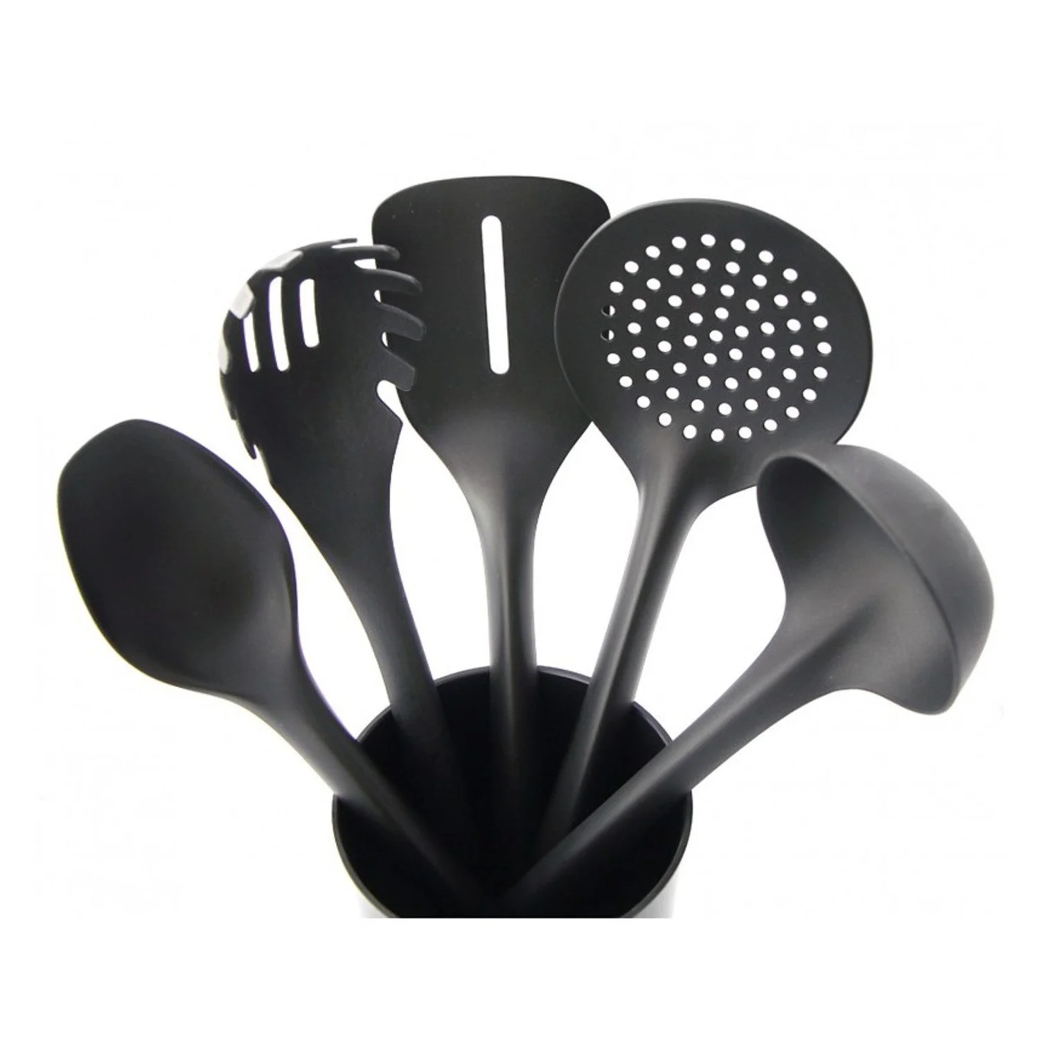 Gefertigt aus robustem, hitzebeständigem Kunststoff (bis 210 °C) sind die Utensilien besonders schonend zu beschichteten Pfannen und Töpfen. Der praktische Behälter hält alle Werkzeuge griffbereit und sorgt für Ordnung auf der Arbeitsfläche.
