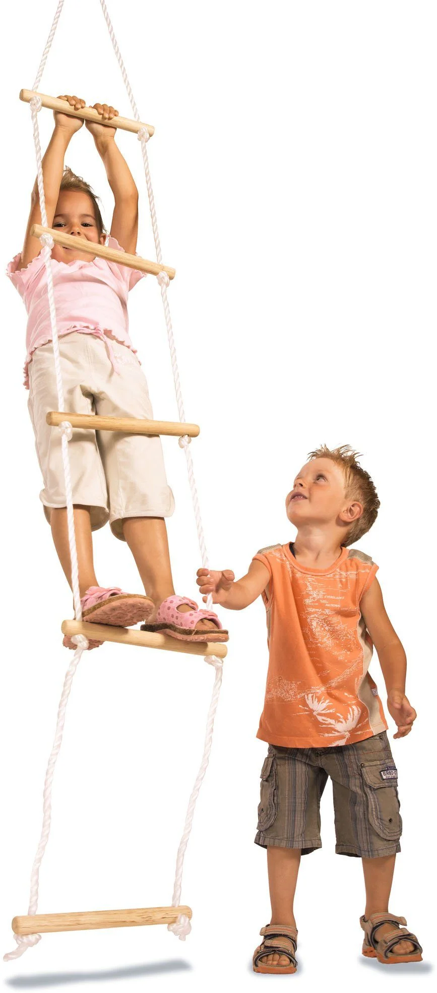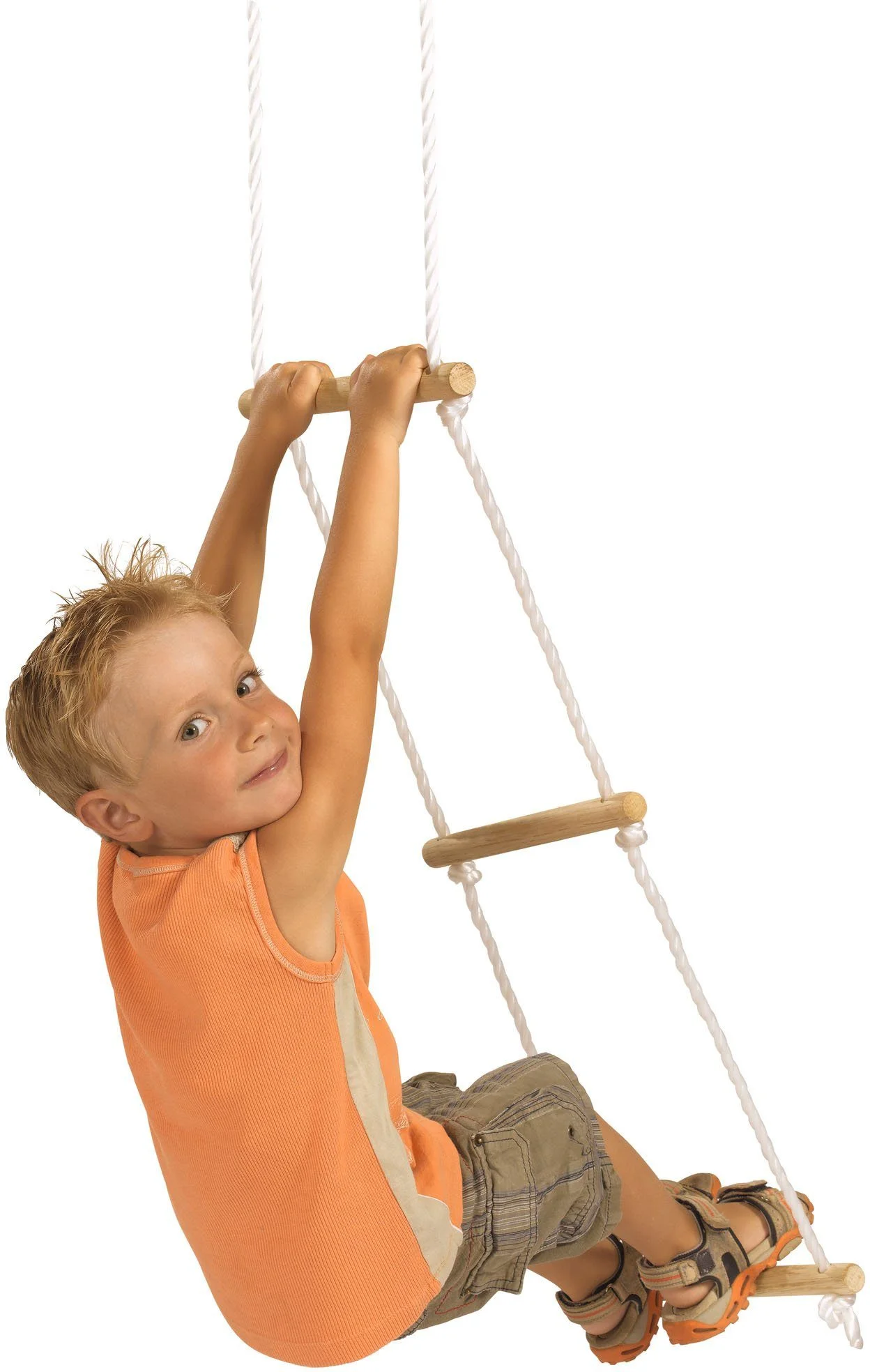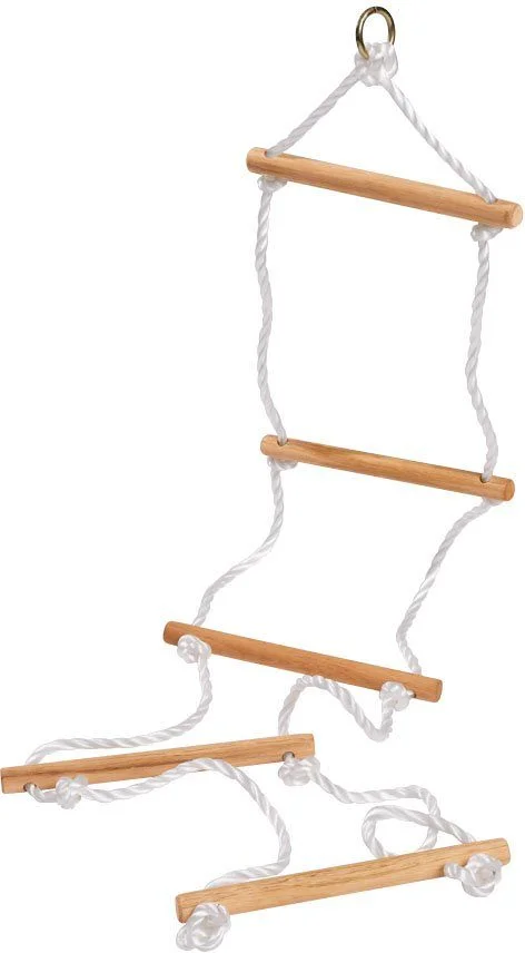 Highlights: Robuste Eichhorn Strickleiter aus Holz und Seilen, 5 Sprossen, wetterfest, ideal für Kletterspaß und Koordination von Kindern. Achtung: Strangulationsgefahr durch lange Seile, nur unter Aufsicht von Erwachsenen verwenden.