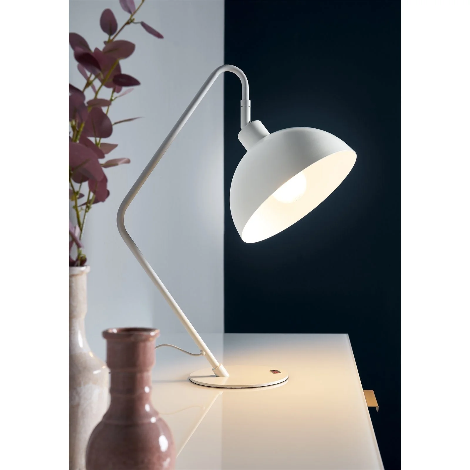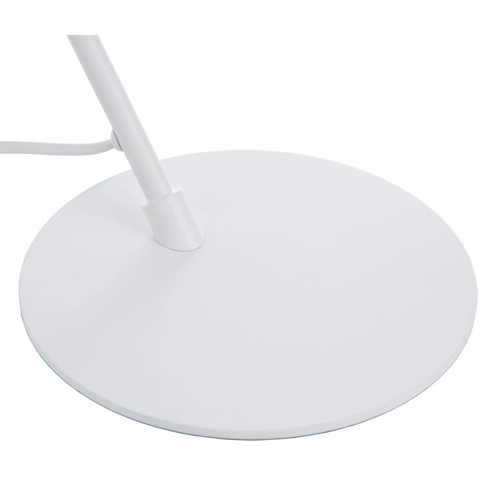 Stilvolle Tischleuchte Twin aus pulverbeschichtetem, weiß-matten Metall im Industrie-Look. Höhe 50 cm, Schirm Ø 22 × H 11 cm, inklusive 150 cm Kabel mit Kippschalter. Perfekt für gemütliche Beleuchtung auf Sideboard, Nachttisch oder Schreibtisch.